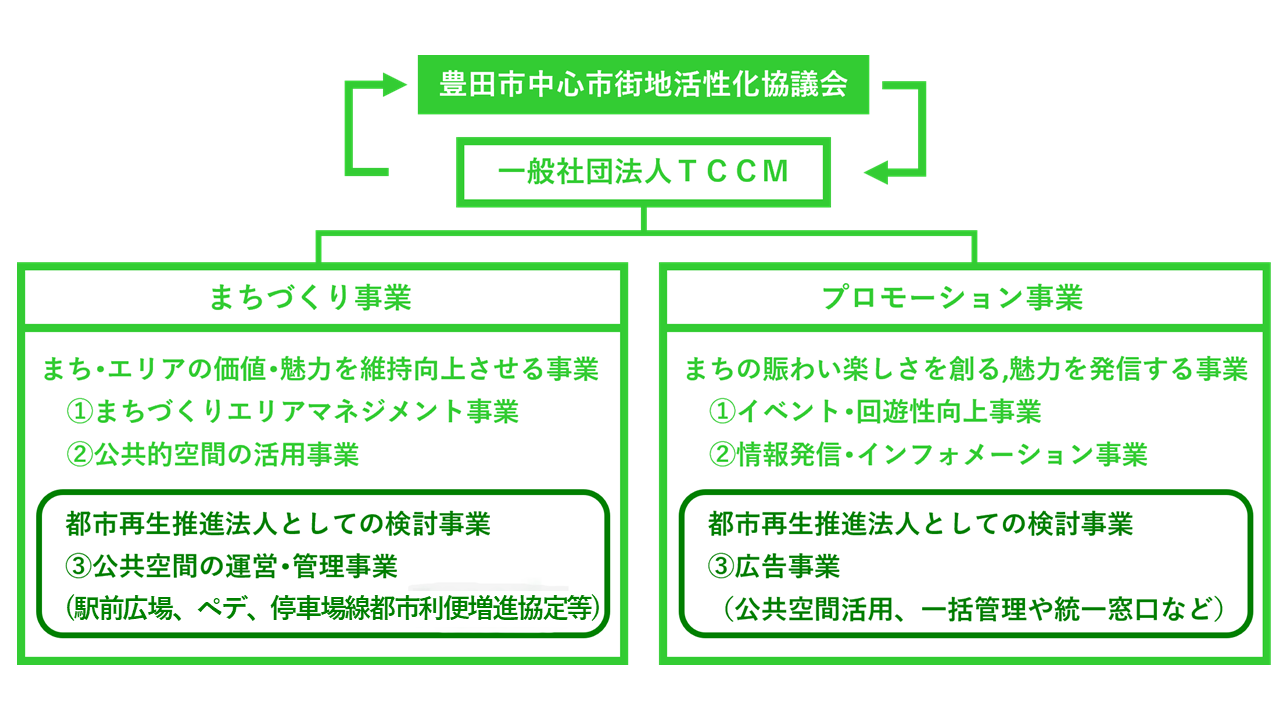 事業目的 豊田市中心市街地・都心において、まちづくり事業やプロモーション事業等を展開し、